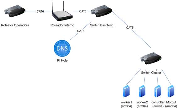 Todos os dispositivos dispões de wifi. No entanto, eu optei por não utilizar o wifi para essas conexões para deixar o roteador mais “leve”. Mas não apenas isso: via cabo a comunicação entre os nodes seria mais rápida. Seria interessante criar uma rede exclusiva para o cluster. O que otimizaria o tráfego ainda mais e não misturaria o “home lab” com a vida cotidiana da casa. Mas daí eu teria que possuir um switch gerenciável. E a grana tá curta pra isso.