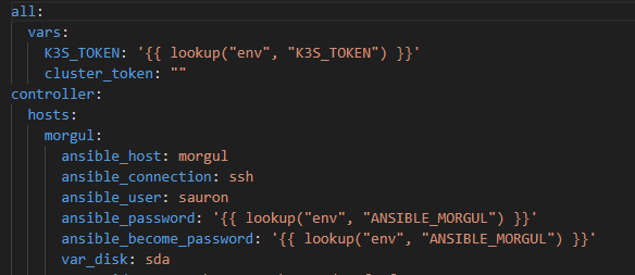 No meu inventory do ansible, possuo uma varíavel onde armazeno, nesse primeiro momento, o nome do disco para manipulação. É interessante utilizar o nome nesse momento, já que ao reconstruir as partições, o UUID será perdido. Então não adicione discos por enquanto.
