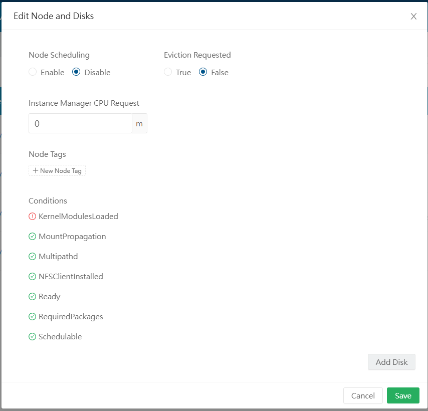 Na coluna “Operation”, você consegue ver as opções possíveis com o node. Clique em “Edit node and Disk”. Um modal com os discos disponíveis no node será aberto. Procure por “Node Scheduling” e marque como “Disable”. Na seção dos discos, mais para baixo no modal, também marque a opção “Scheduling” como “Disable”. Clique no botão “Save” no canto inferior direito (role o mouse, se necessário). Se tentar entrar novamente no node, verá algo como à seguir: