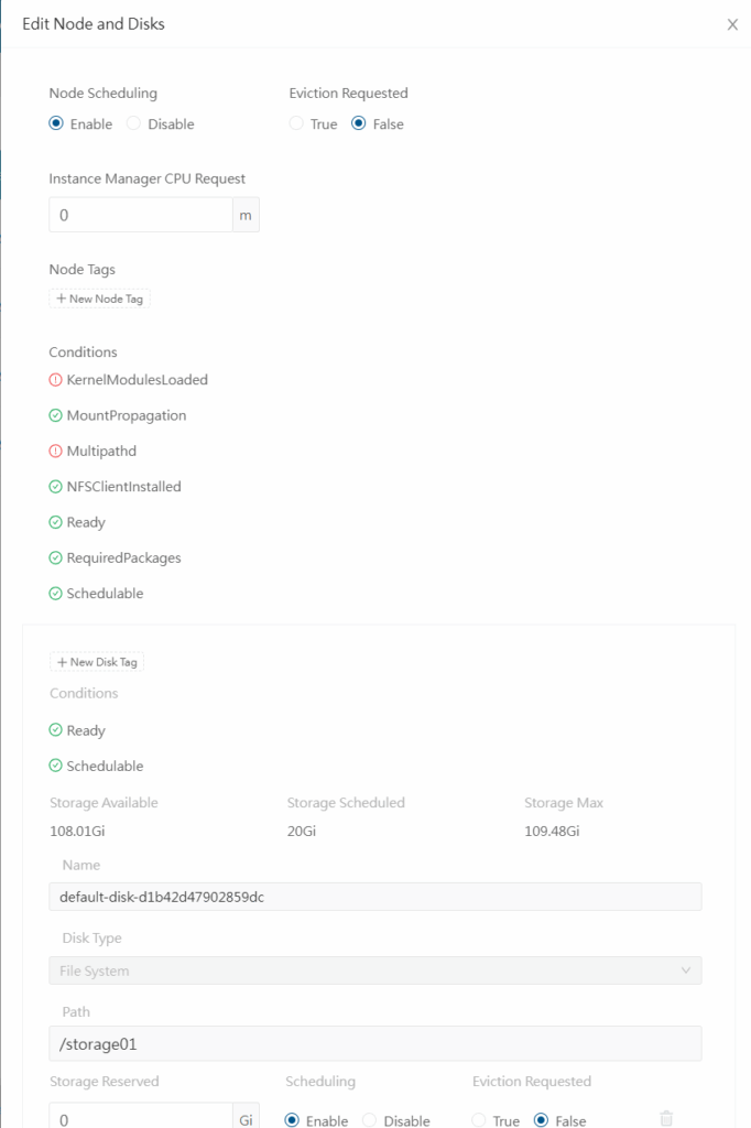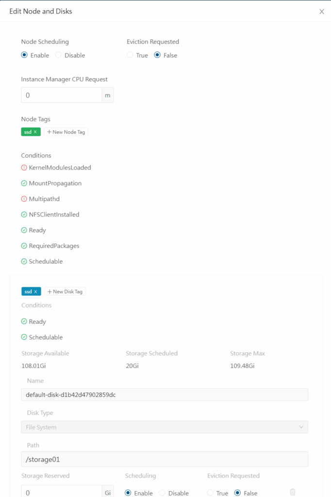 Como você pode ver, é possível fazer várias configurações no node e no disco. Mas por hora vamos nos concentrar nas tags. Crie tags ssd para o node e para o disco, ficando dessa maneira: