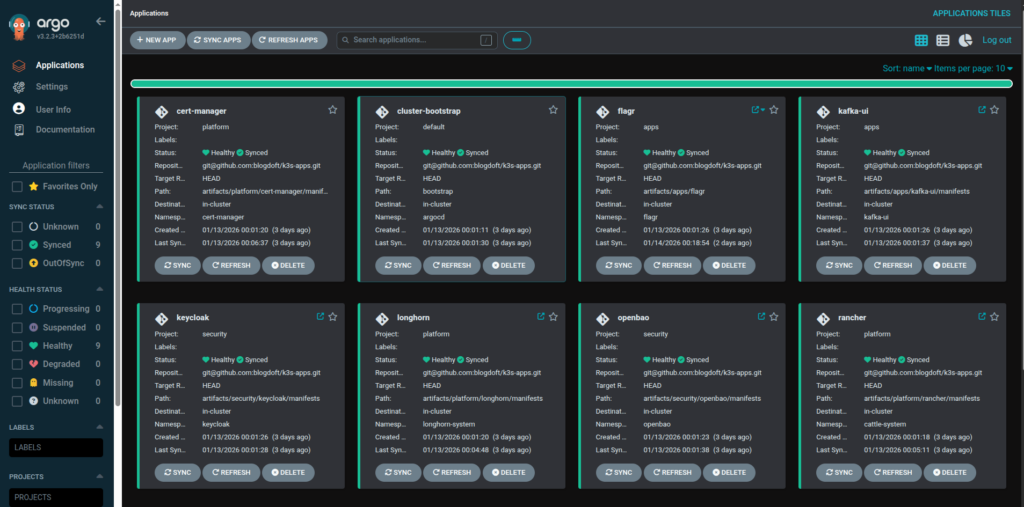 A documentação do ArgoCD já disponibiliza um pequeno projeto “Olá Mundo” para você fazer o deploy. No entanto, se você quiser brincar comigo, eu estou compartilhando o meu repositório também. Lá você vai instalar o cert-manager, flagr, kafbat.ui, keycloak, longhorn, openbao e rancher. Combinando com scripts, eu consigo levantar todo o meu cluster em menos de dez minutos. https://github.com/blogdoft/k3s-apps/tree/main